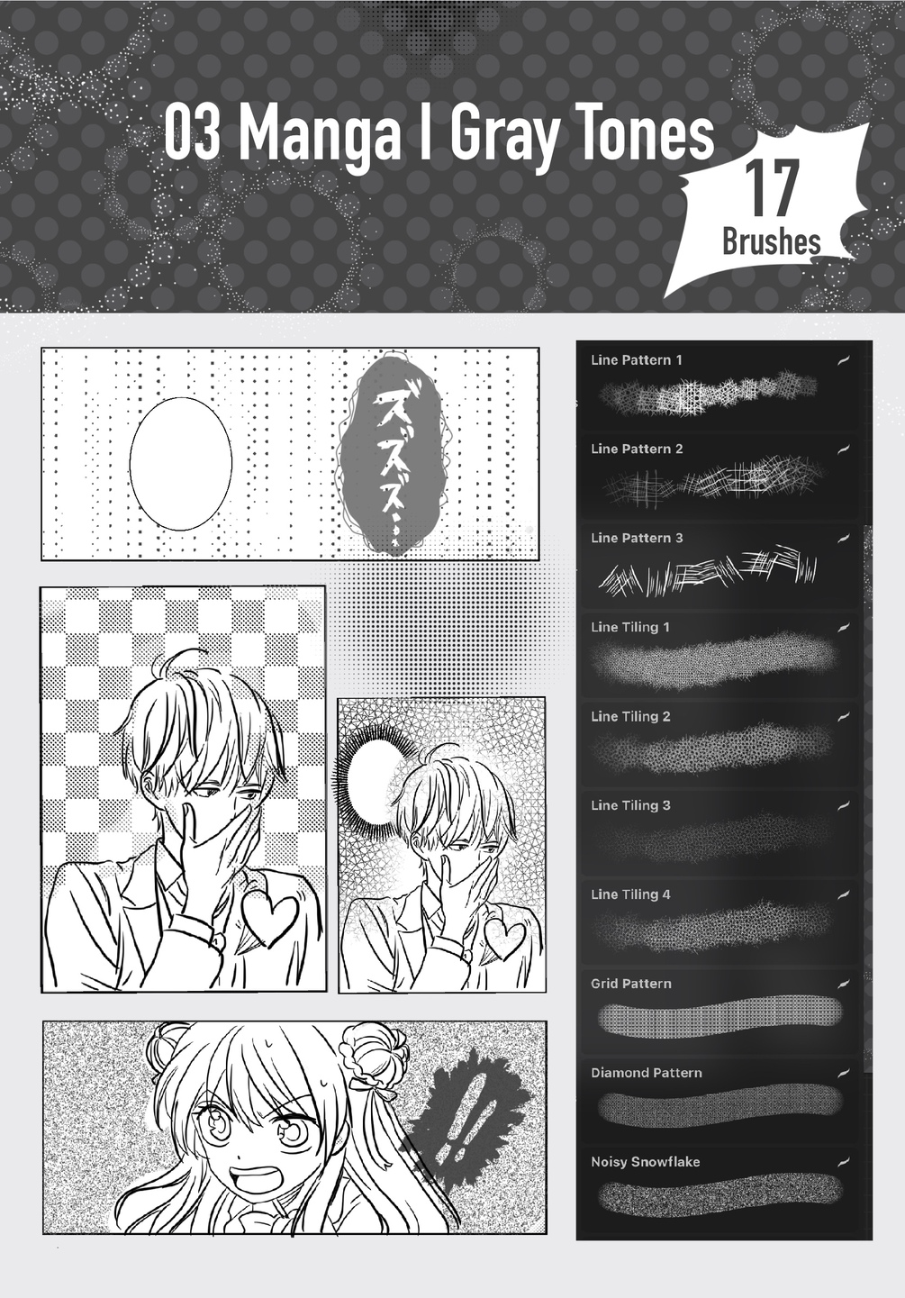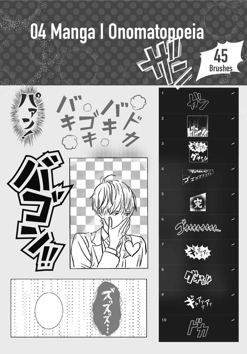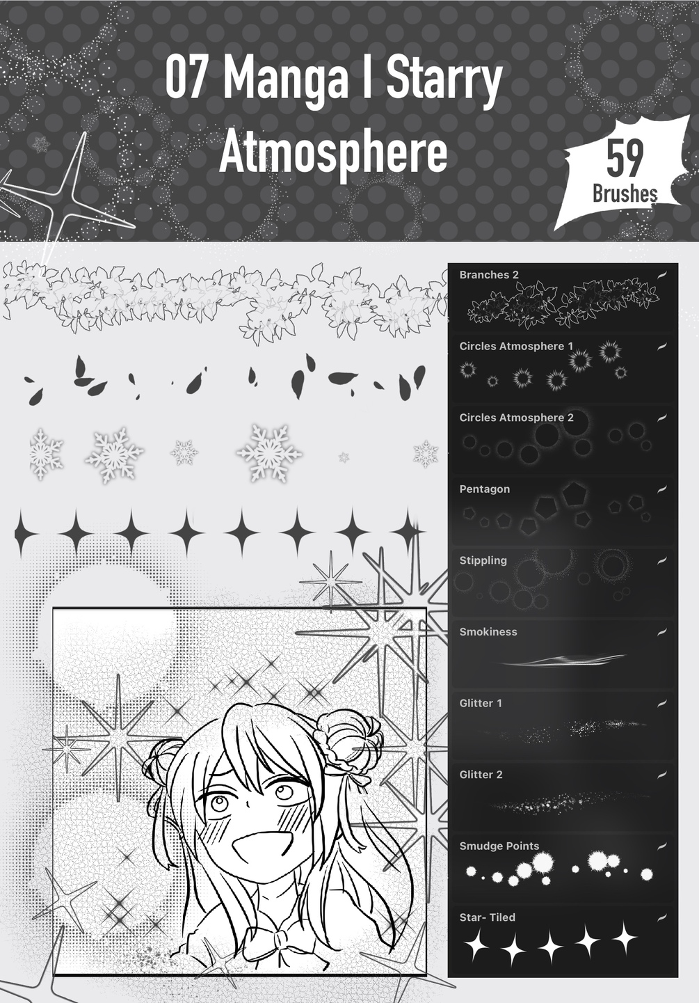 Included Brush Sets: Basics, Dots, Line Elements, Starry Atmosphere, Gray Tones, Dialogue Box, Onomatopoeia, Flower stamps