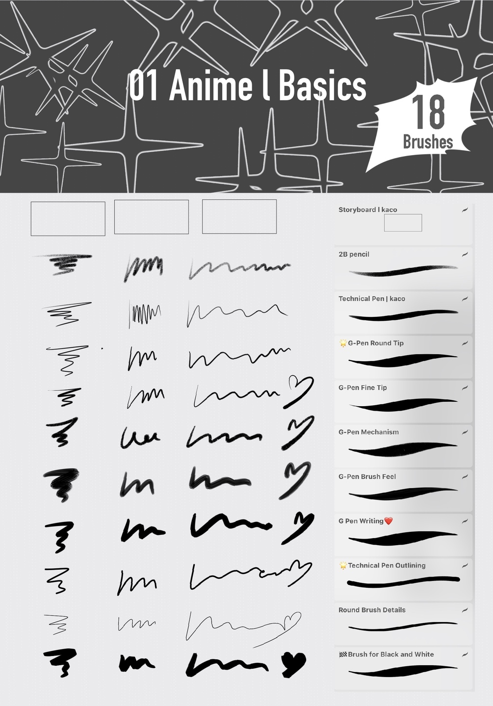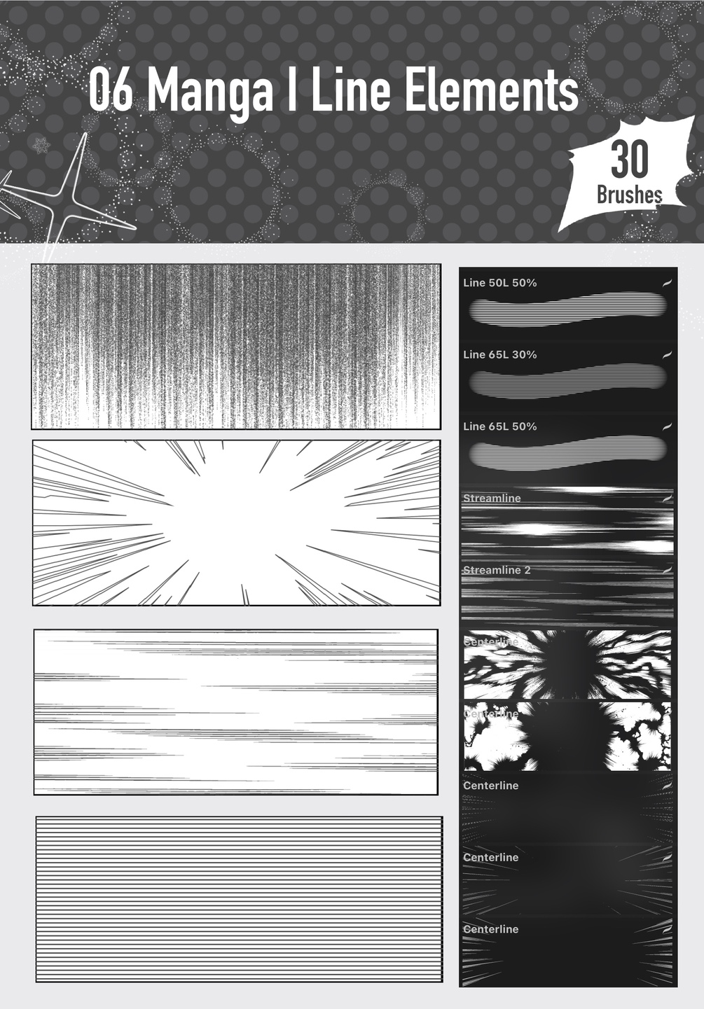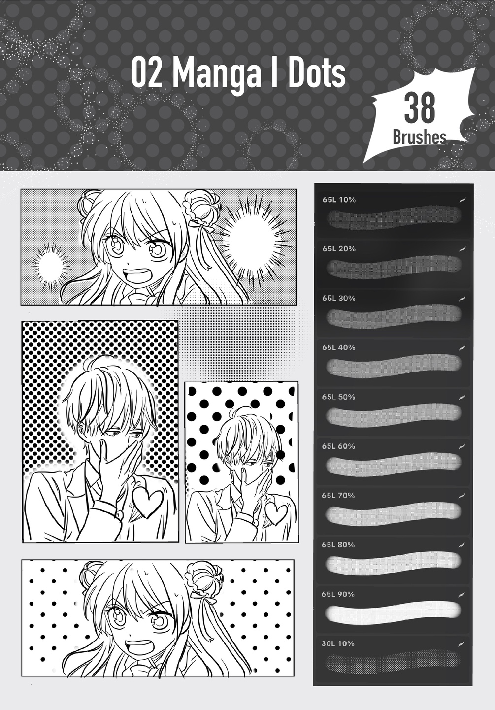 Included Brush Sets: Basics, Dots, Line Elements, Starry Atmosphere, Gray Tones, Dialogue Box, Onomatopoeia, Flower stamps